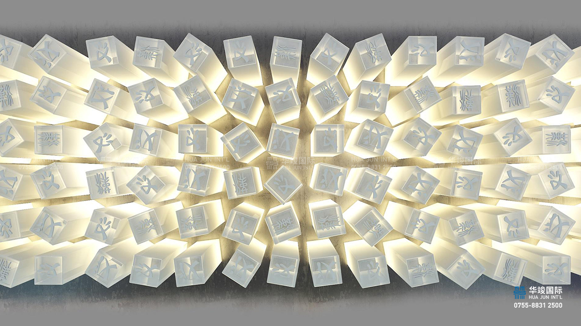 漢中是國(guó)內(nèi)唯一一個(gè)以”漢”字為開(kāi)頭的城市,也是漢人老家、漢文化的發(fā)源地之一,在中國(guó)歷史上有著不可忽視的地位,在漢文化中有著極為重要 的歷史價(jià)值。”漢“字對(duì)于中國(guó)、對(duì)于漢文化、對(duì)于漢中都有著極其特殊的意義,因此,在這里將”漢“字提煉為吊頂元素,以一百八十種不同寫(xiě)法的“漢”字制作為仿印章的造型燈,排布于天花之上,猶如海浪起伏變換,使參觀者感受”漢人老家“的磅礴氣韻。