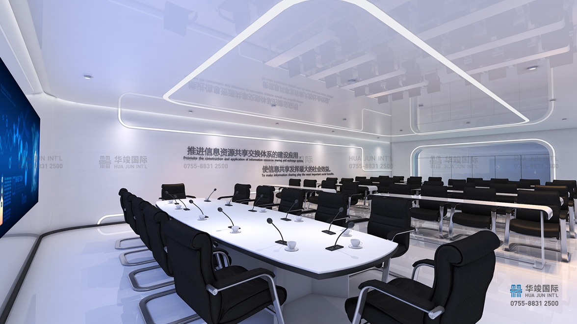 大會議室設有高端視頻會議系統、桌面終端、中控系統等,用戶可以體驗一流的高清視頻和擴展協作功能,智能控制聲光電及隨時切換屏幕畫面,鏈接指揮大廳屏幕系統,實現聯動協同指揮。其設計中注入科技、智能、高效等新興理念,呈現了一個干凈靈活、簡約現代的智慧辦公空間。