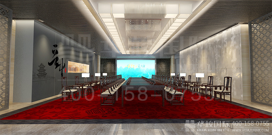 序廳頂部,采用LED矩陣燈組合成文字,以科技新穎的方式呈現(xiàn)公司主題理念。背景墻下以高低錯(cuò)落的LED屏,滾動播放集團(tuán)文化。整個(gè)序廳虛實(shí)結(jié)合,古今交融,四圍采用傳統(tǒng)中式風(fēng)格,天地融合現(xiàn)代科技手段,整體格局相輔相成,渾然一體。