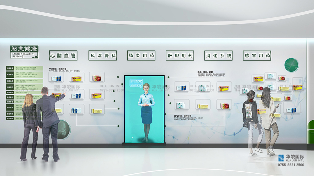 以漢王明星產(chǎn)品為引領(lǐng),以“感冒用藥、消化系統(tǒng)、風(fēng)濕骨科、心腦血管”等功能使用分類,產(chǎn)品陳列結(jié)合LED查詢觸控屏,虛擬講解員對企業(yè)重點藥品的藥理知識進行解刨式、研究性分解展示,也可定點查詢漢王全系藥品的處方來源、功能主治與臨床研究等內(nèi)容,在趣味互動中了解漢王全產(chǎn)品體系。打造科學(xué)、權(quán)威的藥品安全科普。